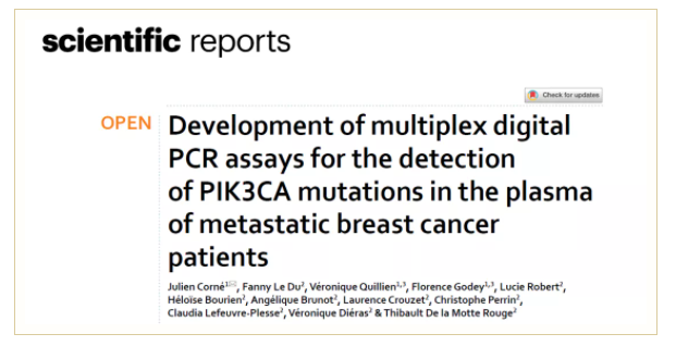 隨著針對(duì)PI3K通路的新療法的批準(zhǔn),PIK3CA突變的檢測(cè)已成為HR+/HER2- 轉(zhuǎn)移性乳腺癌 (MBC) 治療管理的關(guān)鍵因素。法國(guó)雷恩第一大學(xué)尤金馬奎斯癌癥中心在《Scientific Reports》上發(fā)表了一篇文章,該文章采用naica®微滴芯片數(shù)字PCR系統(tǒng)開(kāi)發(fā)了多重PIK3CA突變檢測(cè)技術(shù)。該技術(shù)可同時(shí)檢測(cè)21種PIK3CA突變,并進(jìn)行絕對(duì)定量,解決了當(dāng)前對(duì)乳腺癌患者的21種PIK3CA致病突變進(jìn)行快速、高靈敏、有效檢測(cè)的難題。