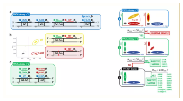 圖1左:PIK3CA突變檢測(cè)的兩種多重檢測(cè)方法設(shè)計(jì)圖。(a) PIK3CA Assay n°1設(shè)計(jì)圖:使用四對(duì)引物(灰色箭頭)同時(shí)擴(kuò)增N345K、C420R、 H1047L和H1047R。使用Drop-off方法檢測(cè)542-546突變。(b) Drop-Off 542-546檢測(cè)原理: WT序列由HEX標(biāo)記的Drop-off探針和cy5標(biāo)記的reference探針檢測(cè),產(chǎn)生一簇HEX-Cy5雙陽(yáng)性微滴(2D點(diǎn)圖上為黃色簇);而542 - 546密碼子上帶有突變(MUT,紅色叉)的序列則無(wú)法與Drop-off探針結(jié)合,只和reference探針結(jié)合,生成單陽(yáng)性微滴(2D點(diǎn)圖上的紅色簇) (c) PIK3CA Assay n°2設(shè)計(jì)圖:使用兩對(duì)引物同時(shí)擴(kuò)增兩個(gè)序列,使用FAM探針標(biāo)記野生型(WT)序列,使用HEX探針標(biāo)記E542K和E545K突變,使用FAM和Cy5探針標(biāo)記H1047L突變,使用Cy5探針標(biāo)記H1047R突變;圖一右:三步診斷策略。