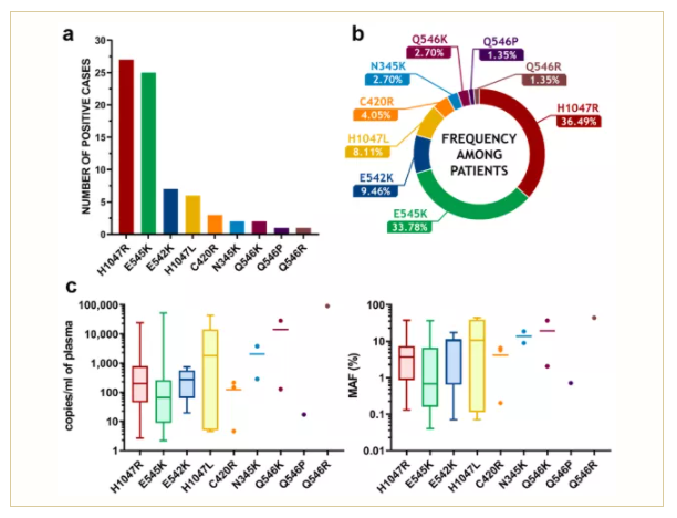 圖3:213例HR + /HER2−轉(zhuǎn)移性乳腺癌患者血漿中PIK3CA突變檢測(cè)(a)在213例HR + /HER2−轉(zhuǎn)移性乳腺癌患者中,PIK3CA檢測(cè)發(fā)現(xiàn)9個(gè)PIK3CA突變陽(yáng)性病例數(shù)。(b)確定的9個(gè)PIK3CA突變的相對(duì)頻率。(c)突變?cè)谘獫{中濃度(copies/ml)和MAF(%)分布 (5例以上的突變用箱線圖表示,5例以下的突變用點(diǎn)表示,2例以上的突變用中位數(shù)線表示)。