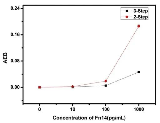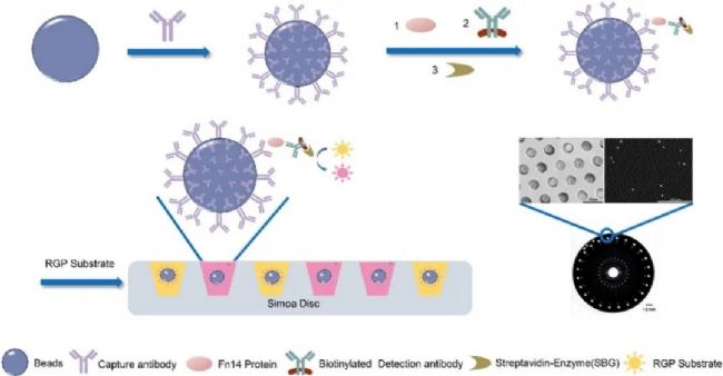首先,將Fn14捕獲抗體包被在磁珠上,并與靶蛋白形成夾心免疫復(fù)合物,然后用SβG標(biāo)記珠子。最后,將珠子推入到光盤的微孔中并與RGP熒光底物反應(yīng)。由于微孔非常小,能檢測到單個酶分子的存在,所以反應(yīng)的靈敏度非常高。通過計算微孔中每個磁珠結(jié)合的平均酶數(shù)(AEB)來檢測Fn14蛋白質(zhì)的濃度。