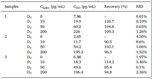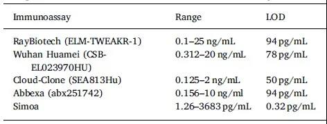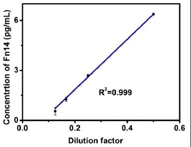 本研究開發(fā)了一種超靈敏的Simoa Fn14檢測方法,該方法在血清樣本中具有良好的特異性和適用性。其LOD為0.32pg/mL,大大低于常規(guī)免疫檢測方法;動態(tài)范圍寬,即使在極低濃度下也可用于準(zhǔn)確檢測血清Fn14。