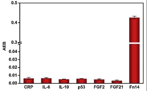 在樣本中加入CRP、IL-6、IL-8、p53、FGF2和FGF21等物質(zhì)作為干擾蛋白(每種濃度為10ng/mL,F(xiàn)n14為100pg/mL)來進行檢測,如圖所示,試劑盒對Fn14的特異性非常高。
