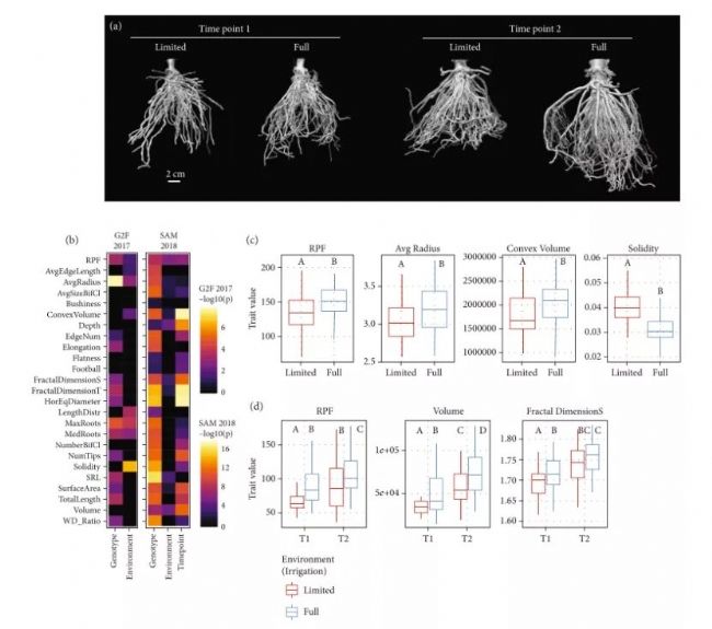 針對(duì)以上問(wèn)題,該文章使用X射線計(jì)算機(jī)斷層掃描(CT)技術(shù),掃描生成高精度玉米根冠三維模型,并建立了能夠同時(shí)測(cè)量71個(gè)特征的處理方法(Figure 1)。該方法改進(jìn)了估測(cè)根系結(jié)構(gòu)遺傳貢獻(xiàn)的流程,且具有極高的精度,能夠全局檢測(cè)根系結(jié)構(gòu)生長(zhǎng)發(fā)育的各種變化或者由環(huán)境變化而產(chǎn)生的根系分布的細(xì)微變化(Figure 2)。論文結(jié)果表明,根提拉力測(cè)量是一種高通量的根系形狀提取方法,可估計(jì)根系質(zhì)量,并且與該文方法中的多個(gè)三維特征顯著相關(guān)(Figure 3)。總而言之,該文提出的方法能夠用于校準(zhǔn)和解讀多種試驗(yàn)場(chǎng)景下的根提拉力測(cè)量值,并且能夠輔助對(duì)根系結(jié)構(gòu)的遺傳研究工作。