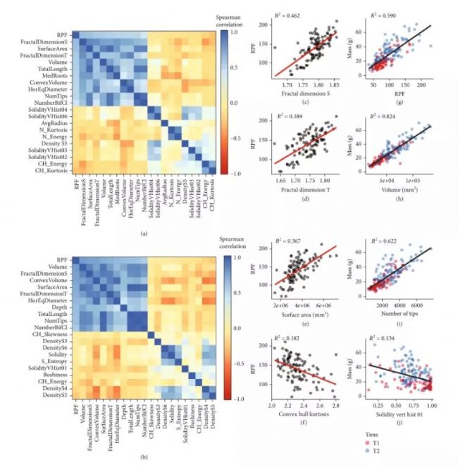 Figure3:RPF and 3D root system architecture traits are strongly associated with each other and root mass (grams).