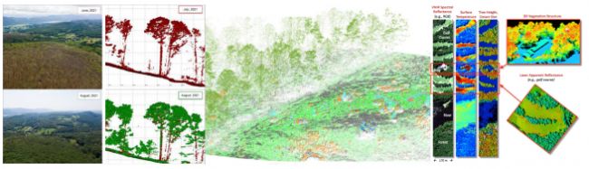 ®無人機(jī)平臺搭載的一體式高光譜-激光雷達(dá)傳感器,在獲取葉片或冠層水平光譜反射的高分辨率成像的同時,激光雷達(dá)傳感器通過主動發(fā)射高頻脈沖能夠直接穿透植被冠層、獲取高精度的植被三維結(jié)構(gòu)信息和生境結(jié)構(gòu)信息,對冠層及結(jié)構(gòu)層面進(jìn)行快速無損高通量原位監(jiān)測、森林物種多樣性研究、植物生物及非生物脅迫分析、環(huán)境及生態(tài)系統(tǒng)動態(tài)變化研究等具有重要意義。