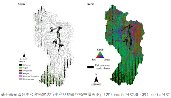 美國的研究學(xué)者將植被光學(xué)(高光譜)和結(jié)構(gòu)(激光雷達(dá))信息結(jié)合,對位于美國愛達(dá)荷州奧懷希山脈的雷諾茲溪實(shí)驗(yàn)流域的干旱地區(qū)(xeric)及半干旱地區(qū)(mesic)進(jìn)行了植被分類研究。這項研究整合了高光譜光譜分類技術(shù)與激光雷達(dá)衍生數(shù)據(jù),利用植被光譜信息、冠層高度及地形信息,提高了半干旱生態(tài)系統(tǒng)的分類精度,成功繪制包含土壤、草和灌木的干旱區(qū)域豐度圖及包含白楊、花旗松、杜松和其他河岸植被的分類地圖。經(jīng)驗(yàn)證,將激光雷達(dá)信息納入高光譜分類方案后,整體分類準(zhǔn)確率從 60% 提高到 89%。