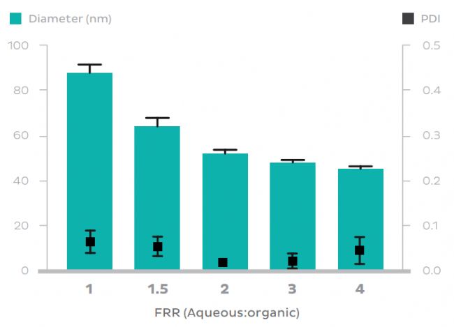 圖1:常規(guī)脂質(zhì)體(liposome)在使用納米藥物制備系統(tǒng)時,通過調(diào)整流速比得到的不同粒徑結(jié)果[1]。