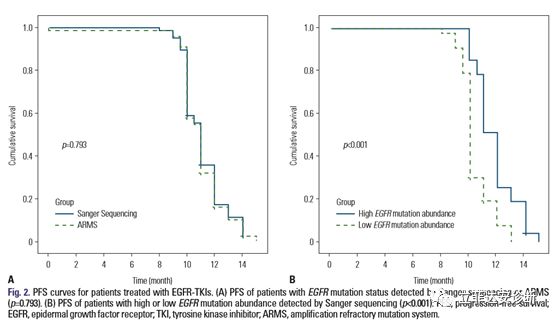 研究結(jié)果表明,Sanger測序可推薦用于EGFR重新檢測和手術(shù)標本的初步檢測。我們確定EGFR-TKI治療后具有高EGFR突變豐度的患者具有更好的結(jié)果。根據(jù)以前的報道,EGFR突變豐度可以預(yù)測晚期NSCLC EGFR-TKI治療的結(jié)果。 因此,在臨床實踐中,Sanger測序為醫(yī)師提供了額外的信息,以預(yù)測患者是否可以從EGFR-TKI獲益。