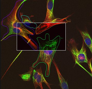 最后,選定譜線的波長(和強度)之間的切換在幾微秒內(nèi)完成,速度非?欤幌啾戎,機械標(biāo)準(zhǔn)濾光片轉(zhuǎn)輪大約需要一秒鐘。這種快速切換使得在單條譜線的掃描期間可以改變激發(fā)方式(采用何種波長的譜線,這些譜線分別對應(yīng)多大強度)。此功能可在樣本上繪制用不同激發(fā)光激發(fā)的區(qū)域,即所謂的“感興趣區(qū)域”,在這些區(qū)域中,不同的激光被激活用于成像。此外,無需采集信號的區(qū)域不會被照射,非常好地保護了樣本以供日后研究。本文開頭的圖片展示了這類感興趣區(qū)域,在單次掃描中應(yīng)用了5種不同的參數(shù)設(shè)置。