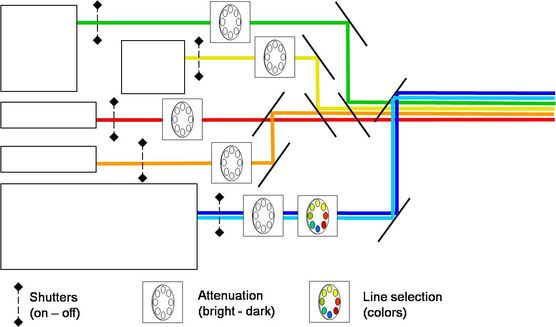 “激光電池”滿足以上所有要求,它由一系列激光器(通常為3-5個)組成。所有激光器均配有光閘,光閘由機電驅(qū)動并由軟件控制。所有激光器都需要一個用于減弱強度的伺服控制設(shè)備(一個帶有一系列灰度濾片濾光片轉(zhuǎn)輪或滑塊)多譜線激光器還需要另一個濾光片轉(zhuǎn)輪或滑塊,它包含一系列邊緣濾片和帶通濾片,以便選擇單譜線或組合譜線。