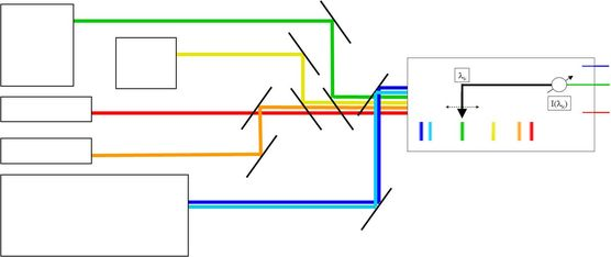 3])。然而,生物醫(yī)學(xué)成像所使用的熒光染料的激發(fā)光譜從近紫外到近紅外的都有。大多數(shù)情況下,為了同時檢測幾種不同熒光染料的發(fā)射情況,需要通過二向色鏡結(jié)合一系列激光譜線來實現(xiàn)。在這種情況下,與在熒光照明中分離激發(fā)和發(fā)射光的“分光鏡”相比,反射鏡以反向模式使用。