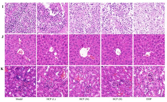 解剖過程順利,腫瘤可完全分離?梢郧宄貐^(qū)分腫瘤組織和周圍組織。腫瘤質(zhì)地較硬,邊界清晰。模型組的體積高于其他組。切片并用H&E染色后,癌細(xì)胞大且異形,細(xì)胞核大且染色強(qiáng)烈。模型組腫瘤細(xì)胞排列緊密,細(xì)胞核多,形態(tài)清晰。DDP組腫瘤細(xì)胞分布較松散,細(xì)胞相對(duì)較少。與模型組相比,HCP處理組異常細(xì)胞相對(duì)較少,細(xì)胞密度較松散(圖2I)。觀察各組肝組織切片。每組小鼠的肝小葉是完整的,肝細(xì)胞沒有放大,細(xì)胞核定位在中間,細(xì)胞間隙清楚,而且沒有明顯的異常(圖2J)。各組腎組織切片未見明顯病理改變。腎小球中發(fā)生病變的膜細(xì)胞或內(nèi)皮細(xì)胞沒有增加(圖2K)。