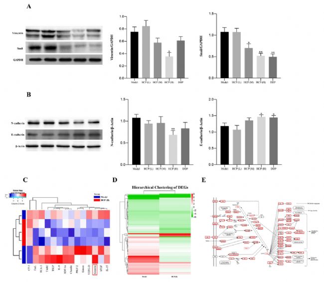 圖3 HCP可抑制EMT、GREM1表達(dá)及相關(guān)通路(A)(B)為蛋白水平結(jié)果,(C)(D)為層次聚類熱力圖,(E)為通路圖