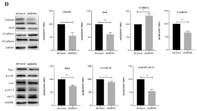 為了進(jìn)一步探索GREM1對(duì)轉(zhuǎn)移影響的潛在機(jī)制,作者研究了其在EMT中的作用。隨著GREM1表達(dá)的增加,間充質(zhì)標(biāo)志物(包括波形蛋白、Snail 和N-鈣粘蛋白)的蛋白質(zhì)水平顯著增加。相比之下,上皮標(biāo)志物E-鈣粘蛋白的水平急劇下降(圖4D)。在用shGREM1處理的A549細(xì)胞中,間充質(zhì)標(biāo)志物的表達(dá)被抑制,上皮標(biāo)志物的表達(dá)顯著增加(圖5D)。因此,GREM1可能通過促進(jìn)EMT進(jìn)展來促進(jìn)NSCLC的遷移和侵襲。作者進(jìn)一步研究了Rap1相關(guān)信號(hào)通路組分(Rap1、c-raf 和 erk1/2)在NSCLC中響應(yīng)GREM1的變化。結(jié)果發(fā)現(xiàn)GREM1過表達(dá)顯著增加了Rap1通路中信號(hào)蛋白相關(guān)基因的表達(dá)(圖4D),反之亦然(圖5D)。因此,這些結(jié)果表明GREM1在Rap1通路的調(diào)節(jié)中起重要作用,并可能通過激活該通路促進(jìn)NSCLC的轉(zhuǎn)移。