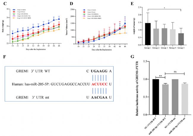 圖6 OE-GREM1不影響A549異種移植裸鼠模型的增殖,而miR-205-5P直接調(diào)控GREM1的表達(dá)