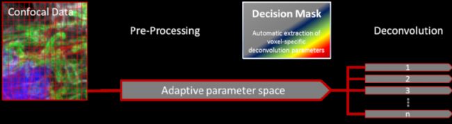 圖2:使用傳統(tǒng)方法從顯微鏡原始數(shù)據(jù)到反卷積圖像的整個反卷積過程(包括預(yù)處理)的圖形表示。使用全局有效的單個(=1)參數(shù)空間來運(yùn)行反卷積。