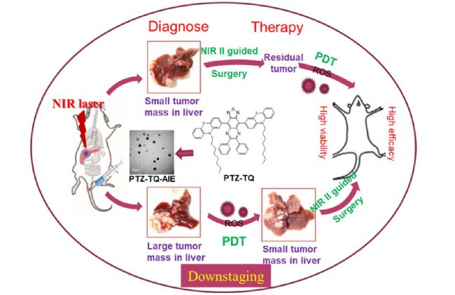 方案1 NIR-II發(fā)射型AIEgen光敏劑PTZ-TQ的示意圖,該光敏劑能夠?qū)崿F(xiàn)超靈敏的成像引導(dǎo)手術(shù)和光療以完全抑制原位肝腫瘤