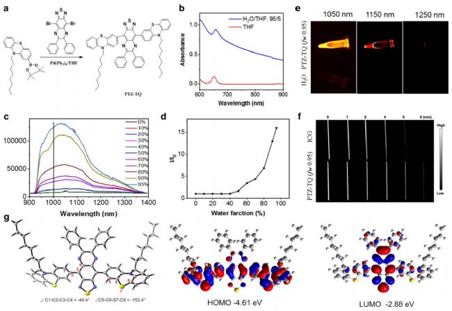 圖1 a)PTZ-TQ分子的合成路線b)PTZ-TQ在四氫呋喃(THF)和水體積分?jǐn)?shù)(FW)為95%的THF/H2O中的b)吸收光譜c)PTZ-TQ在THF/H2O(FW,0%~95%)中的發(fā)射d)發(fā)射強(qiáng)度比(I/I0),根據(jù)PTZ-TQ在不同F(xiàn)W下的(c)計(jì)算e)PTZ-TQ在四氫呋喃/水(FW,95%)和純四氫呋喃中的近紅外-II熒光圖像f)經(jīng)1%脂質(zhì)體溶液檢測(cè)PTZ-TQ和ICG的信號(hào)強(qiáng)度g)計(jì)算了PTZ-TQ的HOMO和LOMO