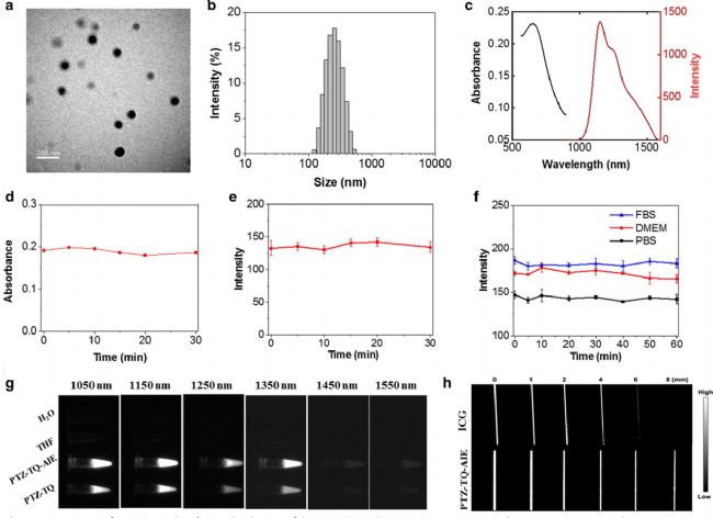 圖2 a) PTZ-TQ-AIE點(diǎn)的TEM圖像b)水中PTZ-TQ-AIE點(diǎn)的尺寸分布c)PTZ-TQ-AIE點(diǎn)在水溶液中的UV-Vis-NIR吸收光譜和NIR-II熒光發(fā)射光譜d)PTZ-TQ-AIE點(diǎn)在間歇808 nm激光(0.25W/cm2)照射60min下在PBS、FBS和DMEM中的光穩(wěn)定性.e)吸光度和f)在808 nm激光(0.25W/cm2)連續(xù)照射30min下的NIR-II熒光發(fā)射g)PTZ-TQ-AIE在水中的 NIR-II熒光圖像h)PTZ-TQ-AIE和ICG通過(guò)不同濃度的1%磷脂溶液的信號(hào)強(qiáng)度