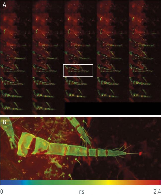 就自發(fā)熒光而言,這通常代表不同的分子種類或其組合。我們可以很好地區(qū)分觸角和腿周圍殼多糖化的外骨骼(綠色到藍(lán)色)。殼多糖的壽命很短。周圍組織的熒光壽命比較均一接近3 ns(黃色)。某些具有較長壽命(橙色)的區(qū)域可能代表其他物質(zhì),但在此處,它們更可能代表較暗的區(qū)域,這些區(qū)域在熒光壽命的測量精度較低。