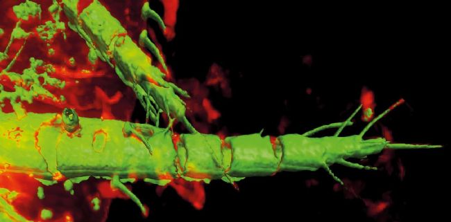 圖3:使用圖2中顯示的層切圖像形成觸角的3D圖像。殼多糖化結(jié)構(gòu)出現(xiàn)在帶有陰影的等值面渲染中(綠色)與周圍組織的3D圖像重疊顯示。(3D可視化使用外部軟件完成)。