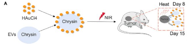 但白楊素與金納米粒子在單獨(dú)運(yùn)用時(shí)對(duì)癌癥缺乏特異性,有證據(jù)表明,納米粒子與 EVs結(jié)合可作為靶向癌細(xì)胞的藥物載體。因此,納米材料與 EVs 結(jié)合可以提高癌癥治療的效率。