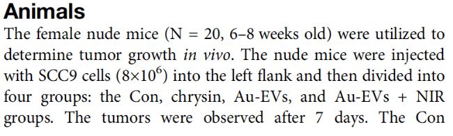 在該實(shí)驗(yàn)中,首先將SCC9 細(xì)胞注射到裸鼠體內(nèi)。7天后,將Au-EVs注射到腫瘤下方,并在第8天和第15天用近紅外光照射裸鼠并進(jìn)行腫瘤生長(zhǎng)分析。結(jié)果表明,Au-EVs具備腫瘤靶向性,且熒光強(qiáng)度隨時(shí)間增加而增加。此外,近紅外輻射可以淬滅 Au-EVs 的熒光。在第21天時(shí)收集腫瘤,與預(yù)期結(jié)果相符,Au-EVs 與 NIR 結(jié)合顯著抑制了腫瘤生長(zhǎng),并且沒有改變體內(nèi)其他器官。
