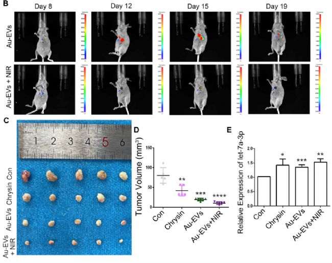 本研究發(fā)現(xiàn),Au-EVs作為一種新型納米材料,在SCC9 細(xì)胞中具有吸收特異性。在經(jīng)過近紅外輻射后,Au-EVs 能夠有效增強(qiáng)細(xì)胞凋亡。通過RNA-seq,篩選 EVs-chrysin miRNA,Let-7a-3p,并且過表達(dá)let-7a-3p會(huì)誘導(dǎo)細(xì)胞凋亡,此結(jié)果表明經(jīng)NIR 處理的 Au-EV 顯著抑制了體內(nèi)腫瘤的生長(zhǎng)。