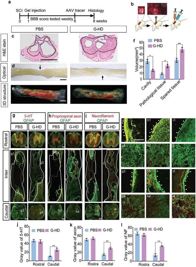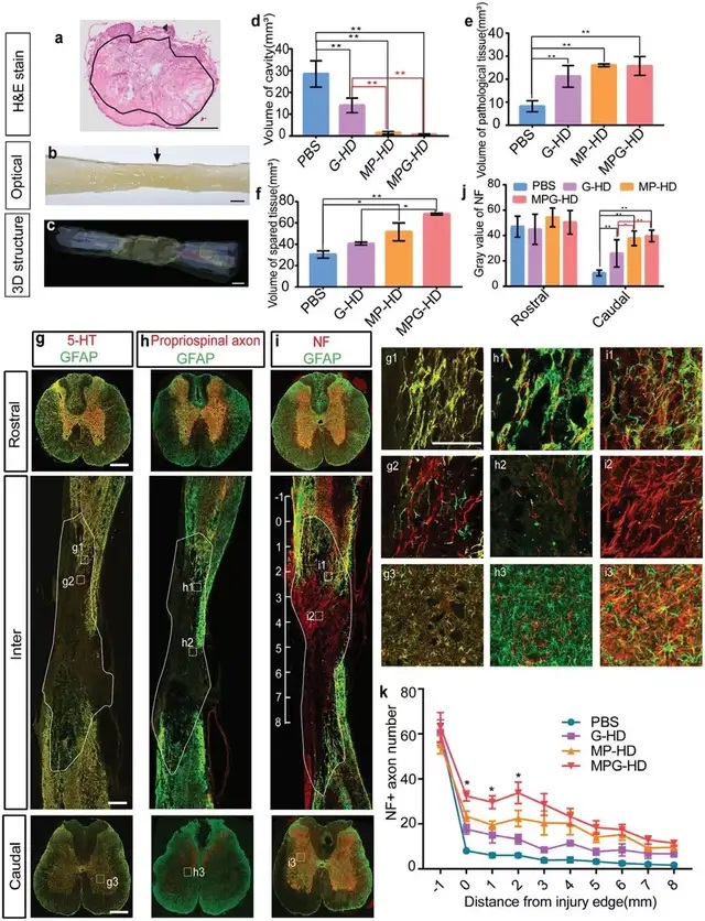 在功能和行為方面,第5 周時(shí),G-HD 組大鼠可見明顯的踝關(guān)節(jié)運(yùn)動(dòng),并在注射9 周后達(dá)到功能平臺(tái)。MP-HD 組7周后大鼠可見足底踏地和負(fù)重步行,表明 MP-HD 治療具有防止空腔形成和保護(hù)備用幸存組織/軸突的能力。然而,與 MP-HD相比,MPG-HD 治療未能進(jìn)一步改善功能恢復(fù),表明 MPG-HD 治療誘導(dǎo)的再生軸突不能自發(fā)發(fā)揮功能。