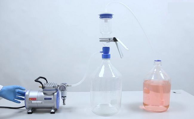 過濾除菌,常用的負(fù)壓過濾裝置,一般一次只能過濾少量的培養(yǎng)基而且得從抽濾瓶倒出到藍(lán)蓋瓶保存,這過程的操作比較麻煩、效率低,還可能造成二次污染。所以如何選擇培養(yǎng)基過濾除菌的過濾裝置是非常關(guān)鍵的。