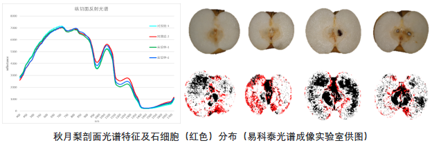 梨的石細(xì)胞是梨果實(shí)所特有的,它的存在不僅影響梨果實(shí)的食用品質(zhì),也影響加工品質(zhì)。石細(xì)胞是由大量木質(zhì)素和纖維素所組成的厚壁細(xì)胞,其分布由近果皮部果肉至近果心部逐漸增多。易科泰光譜成像實(shí)驗(yàn)室技術(shù)人員使用PhenoTron®-HSI果實(shí)品質(zhì)高光譜無(wú)損檢測(cè)技術(shù)(400-1700nm),對(duì)不同條件下生長(zhǎng)的梨果中石細(xì)胞分布進(jìn)行了光譜成像分析。如下右圖,從左至右依次未施加營(yíng)養(yǎng)素的秋月梨(對(duì)照組-1、2)以及施加營(yíng)養(yǎng)素后的秋月梨(實(shí)驗(yàn)組-1、2)。