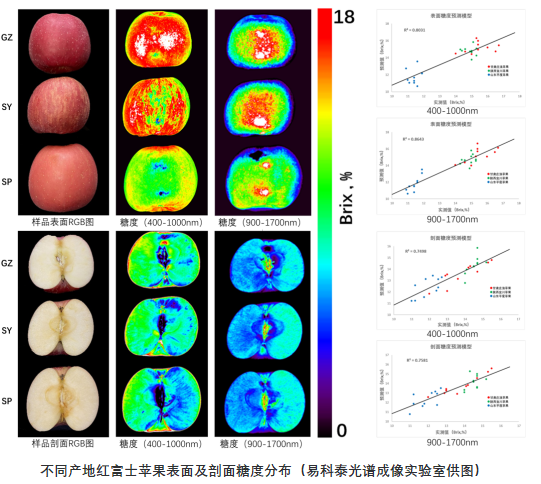 ®-HSI果實(shí)品質(zhì)高光譜無(wú)損檢測(cè)技術(shù)(400-1700nm),分別對(duì)產(chǎn)自甘肅莊浪(GZ)、陜西宜川(SY)、山東平度(SP)三個(gè)不同產(chǎn)地的2021年秋季采摘的紅富士蘋(píng)果進(jìn)行光譜成像分析,并分別選取三種樣品表面及剖面各10個(gè)區(qū)域?qū)崪y(cè)糖度,建立預(yù)測(cè)模型評(píng)估糖度分布。