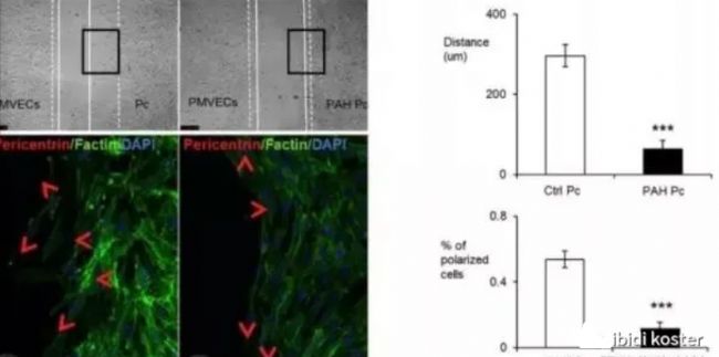 由圖可見(jiàn),相對(duì)于左側(cè)的對(duì)照,右邊的PAH來(lái)源的Pericytes遷移距離較短,并且從熒光標(biāo)記圖上可見(jiàn),紅色箭頭表示遷移的方向,PAH組無(wú)特定方向,不受PMVEC的影響。柱狀圖為統(tǒng)計(jì)結(jié)果。