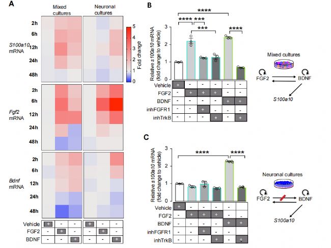 為了了解神經(jīng)元-膠質(zhì)細胞依賴的BDNF合成調(diào)控,研究者分析了混合培養(yǎng)和神經(jīng)元培養(yǎng)中FGF2和BDNF依賴的S100a10轉(zhuǎn)錄調(diào)控。研究者發(fā)現(xiàn)FGF2僅在混合培養(yǎng)中誘導S100a10的轉(zhuǎn)錄,而BDNF在混合培養(yǎng)和神經(jīng)元培養(yǎng)中均誘導S100a10的轉(zhuǎn)錄。這些結(jié)果表明,上游FGF2信號轉(zhuǎn)導可能與需要神經(jīng)膠質(zhì)細胞信號轉(zhuǎn)導的BDNF合成有關(guān)。接下來,研究者分析了FGF2和BDNF信號轉(zhuǎn)導之間的相互作用,并觀察到一種強烈的正向自動反饋調(diào)節(jié)。在混合培養(yǎng)和神經(jīng)元培養(yǎng)中,應用FGF2可刺激FGF2 mRNA,而應用BDNF可刺激BDNF mRNA。有趣的是,研究者觀察到一個強大的互惠交叉調(diào)節(jié), FGF2僅在混合培養(yǎng)中刺激BDNF mRNA,而在神經(jīng)元培養(yǎng)中沒有。這些結(jié)果表明,依賴于fgf2的S100a10表達的刺激是通過激活BDNF-TrkB信號,需要神經(jīng)元與神經(jīng)膠質(zhì)細胞的相互作用。因此,研究者抑制了TrkB受體的激活,并證明在混合培養(yǎng)中,S100a10轉(zhuǎn)錄的fgf2依賴刺激是通過激活TrkB信號來實現(xiàn)的。正如預期的那樣,在混合培養(yǎng)和神經(jīng)元培養(yǎng)中,抑制FGFR1受體(主要與FGF2結(jié)合)后,S100a10的FGF2刺激被下調(diào),而抑制TrkB受體激活后,S100a10的BDNF刺激被下調(diào)。這些結(jié)果表明,F(xiàn)GF2僅通過依賴神經(jīng)膠質(zhì)細胞的方式調(diào)控BDNF合成,以及隨后激活神經(jīng)元中的BDNF - trkb信號通路來刺激S100a10的表達。