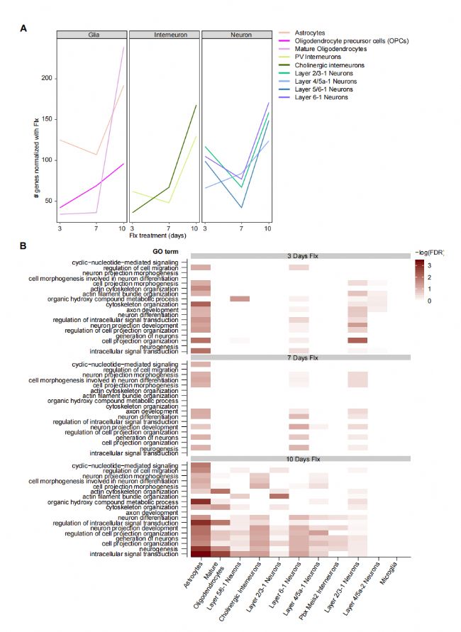 接下來,研究者通過基因本體論(GO)分析,在個體膠質(zhì)和神經(jīng)元細胞群體水平上分析了應激影響氟西汀正常化基因的動態(tài)變化,發(fā)現(xiàn)在抗抑郁藥物的早期反應中,神經(jīng)膠質(zhì)和神經(jīng)元群體都參與了。少突膠質(zhì)細胞前體(OPC)細胞在治療第7天也有顯著差異表達。最后,在治療第10天,多個神經(jīng)元群體、表達小清蛋白(PV)的中間神經(jīng)元、星形膠質(zhì)細胞和成熟少突膠質(zhì)細胞的基因表達發(fā)生變化。成熟少突膠質(zhì)細胞僅在治療第10天發(fā)生變化。與多個神經(jīng)元群體的改變同時發(fā)生。這些觀察表明,神經(jīng)膠質(zhì)和神經(jīng)元群體對氟西汀治療有高度組織性的反應。