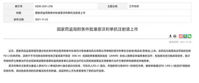 11月25日,國家藥監(jiān)局官網(wǎng)顯示,恩沃利單抗注射液通過優(yōu)先審評審批程序附條件批準(zhǔn)上市,這是獲批的國產(chǎn)PD-L1抗體,同時與大多數(shù)同靶點產(chǎn)品給藥方式不同,這是一款可用于皮下注射的抗PD-L1單克隆抗體。