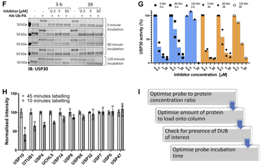 由圖3結(jié)果可知,隨著培養(yǎng)時(shí)間的延長(zhǎng),尤其是3-b抑制劑,從DUB中轉(zhuǎn)移出來(lái),抑制劑的效力較低。因此,對(duì)于可逆抑制劑,建議盡量減少探針的孵育時(shí)間。使用ABPP-HT工作流程比較了兩次標(biāo)記時(shí)間,當(dāng)裂解物與探針一起孵育較短時(shí)間(10 min VS 45 min 圖2H)時(shí),一些DUB的強(qiáng)度明顯降低。因此作者在圖2I總結(jié)了這些優(yōu)化步驟:(i)優(yōu)化探針與蛋白質(zhì)的濃度比;(ii)優(yōu)化要加載到柱上的蛋白質(zhì)量;(iii)檢查是否存在感興趣的DUB;(iv)優(yōu)化探針?lè)跤龝r(shí)間。