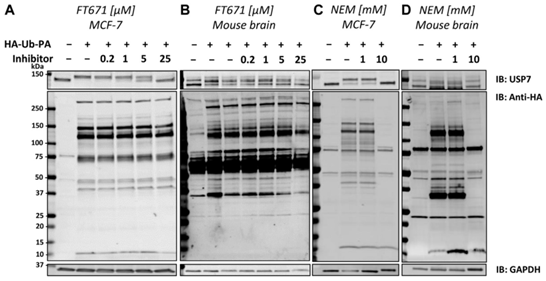 圖4(A-D)小鼠腦組織和MCF-7細(xì)胞裂解物中FT671特異性抑制劑和NEM(半胱氨酸修飾物)濃度依賴(lài)性的USP7、HA和GAPDH免疫印跡。FT671在細(xì)胞系(圖4A)和腦組織(圖4B)中均抑制USP7,HA印跡顯示FT671與其他標(biāo)記DUB的反應(yīng)性很小。另一方面,NEM也在細(xì)胞(圖4C)和大腦(圖4D)中抑制USP7。