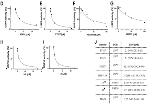 圖5(A-C)分別從timsTOF MS中鑒定出的MCF-7、小鼠腦裂解液、MCF-7裂解液的DUB活性分析。(D-I)MCF-7裂解液中USP7抑制劑FT671、FT827、HBX41108和P22077的濃度依賴(lài)性,以及小鼠大腦中3-b和39的USP30抑制劑的濃度依賴(lài)性。圖(J)為D-I提取的IC50值,擬合方程為Y=100/(1 + X/IC50)。分析多種濃度的能力也允許繪制和確定所述條件下每種抑制劑的半最大抑制濃度(IC50)。