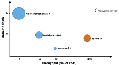 圖6比較DUB鑒定深度的ABPP分析(Y軸)和不同檢測(cè)方法包括傳統(tǒng)ABPP、基于免疫印跡的ABPP和高通量ABPP(ABPP-HTP)的分析。X軸代表不同方法的檢測(cè)樣本數(shù)量,繪制的圓圈大小代表了每種受試抑制劑化合物的相對(duì)成本?梢钥闯作者新開(kāi)發(fā)的檢測(cè)方法(ABPP-HTP)的鑒定深度略低于傳統(tǒng)方法,但通量遠(yuǎn)大于傳統(tǒng)方法。新方法大大提高了檢測(cè)效率。