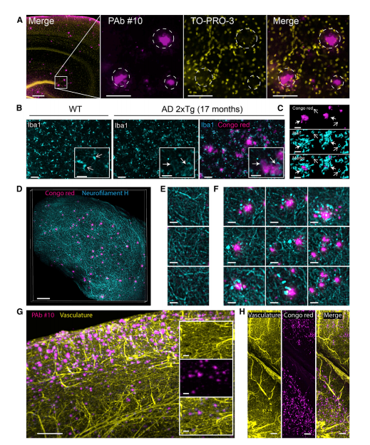 阿爾茲海默癥(AD)是一種起病隱匿的進(jìn)行性發(fā)展的神經(jīng)系統(tǒng)退行性疾病。臨床上以記憶障礙、失語(yǔ)、失用、失認(rèn)、視空間技能損壞、執(zhí)行功能障礙以及人格和行為改變等全面性癡呆表現(xiàn)為特征,細(xì)胞外β淀粉樣蛋白沉積和細(xì)胞內(nèi)tau蛋白磷酸化是AD的主要病理特征。Liebmann等人利用iDISCO技術(shù)對(duì)阿爾茲海默癥模型小鼠腦進(jìn)行透明化闡明了β淀粉樣蛋白沉積和小膠質(zhì)細(xì)胞及脈管系統(tǒng)之間的空間分布關(guān)系,這將對(duì)阿爾茲海默癥的科學(xué)研究和治療產(chǎn)生重大意義。