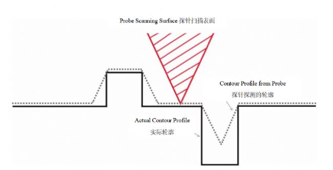 圖1:探針形狀如何影響所獲得2D輪廓或表面3D形貌圖示。探針形狀與表面特征卷積。