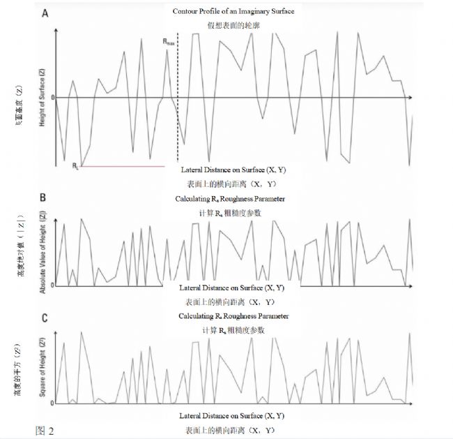 圖2:使用假想表面的輪廓來(lái)計(jì)算表1中參數(shù)Rmax(A)、Ra(B)和Rq(C)的示例。對(duì)于Ra,B中的|Z|值取平均值。對(duì)于Rq,C的Z2值取平均值,并取平均值的平方根。