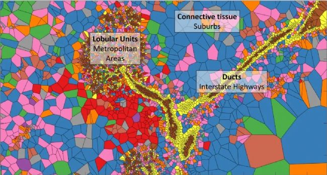 研究小組發(fā)現(xiàn),乳腺導管和小葉的細胞密度和多樣性最高。Voronoi分析說明了組織內(nèi)細胞生態(tài)系統(tǒng)的結構。Kessenbrock博士恰當?shù)貙⑿∪~單位的高細胞密度和多樣性與城市和大都市地區(qū)的高人口密度和多樣性進行了比較,而管道對應于州際公路。結締組織和脂肪組織表現(xiàn)出與郊區(qū)和農(nóng)村相同的低密度和多樣性。