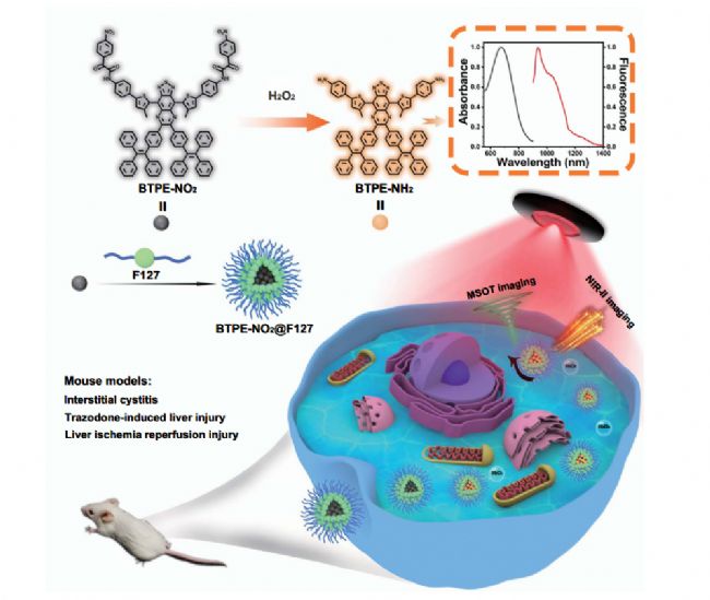 本文要點:苯并噻二唑核發(fā)色團具有良好的穩(wěn)定性、較大的斯托克偏移和易于擴展發(fā)射到NIR-II范圍等優(yōu)點。然而,在充分發(fā)揮其生物應用潛力之前,還需要克服水溶性差、水溶液中的聚集致猝滅ACQ和非活化反應等障礙,這些熒光團通常是惰性探針,發(fā)出不變的或“一直開著”的信號,構成附加的背景噪音,不能對特定刺激做出反應,無法實現(xiàn)生物標志物激活的檢測或成像。在本研究中,作者設計了一種可激活的苯并噻二唑核納米探針BTPE-NO2@F127,此探針具有AIE特性,通過整合生物標記物響應部分和采用封裝分子探針的自組裝設計策略克服上述障礙,該納米探針用于體內(nèi)NIR-II熒光成像和MSOT成像能夠原位響應曲唑酮誘導的肝損傷,肝缺血再灌注損傷(I/R)和間質性膀胱炎小鼠模型中的H2O2生物標志物進而進行檢測和成像,此外,獲得的三維MSOT圖像有利于三維信息的疾病部位可視化。