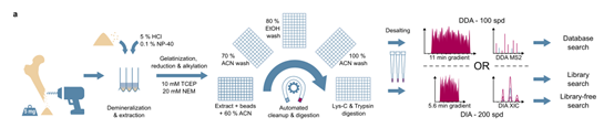 為了提高吞吐量,作者開發(fā)了一種新的樣品制備方案,該方案由幾個(gè)手動(dòng)步驟組成,便于放大(圖1)。作者比較了幾種不同的提取緩沖液成分,最后選擇了鹽酸和非離子洗滌劑NP-40的混合物,將脫鹽和蛋白質(zhì)提取結(jié)合起來。蛋白質(zhì)是通過同時(shí)脫礦和萃取從骨屑或骨粉中獲得的,蛋白質(zhì)聚集清除磁性小球處理機(jī)器人可以自動(dòng)捕獲和消化。肽通過串聯(lián)質(zhì)譜快速分離和分析,每天的吞吐量為100個(gè)樣本(DDA)或每天200個(gè)樣本(DIA)。