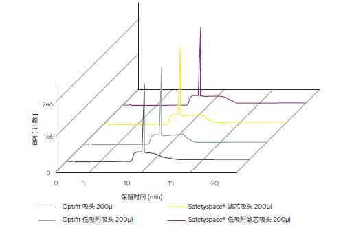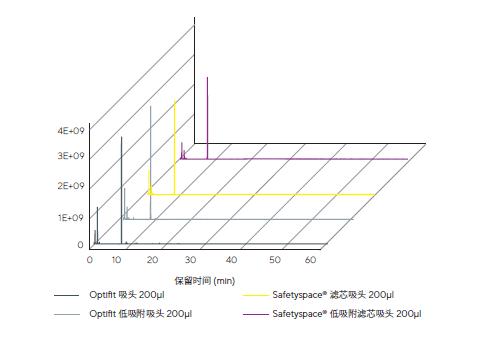 ®濾芯吸頭及其低吸附吸頭在移取易溶出樣品時的浸出物情況進行了測試。這些移液器吸頭被證明實際上不含浸出化合物,因此適用于高度敏感的分析方法。