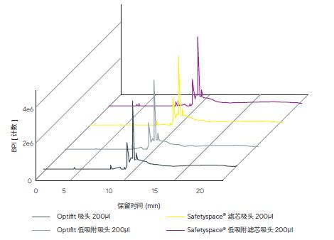 ®濾芯吸頭(產(chǎn)品編號790201F)和低吸附吸頭( 產(chǎn)品編號LH-L790200和LH-LF790201)),將溶劑吸入移液器吸頭,保持5秒鐘并直接分液到樣品試管中。使用多個相同類型的移液器吸頭(5個移液器吸頭,共500μL,混合樣品) 產(chǎn)生足夠的測試體積,通過HPLC-UV/VIS、GC-MS或LC-HRMS 進行實驗室設備相關的浸出物分析。
