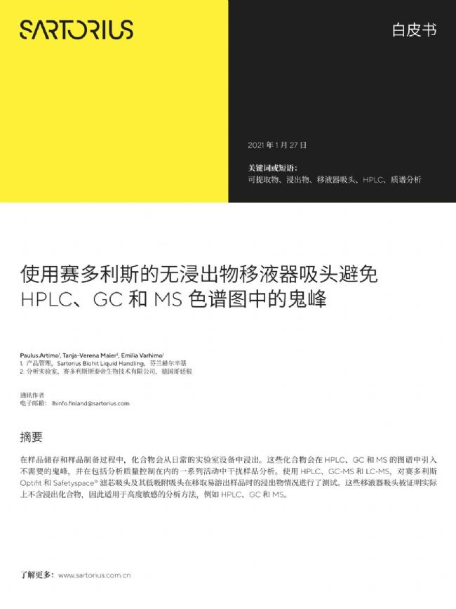 《使用賽多利斯的無浸出物移液器吸頭避免 HPLC、GC 和 MS 色譜圖中的鬼峰》