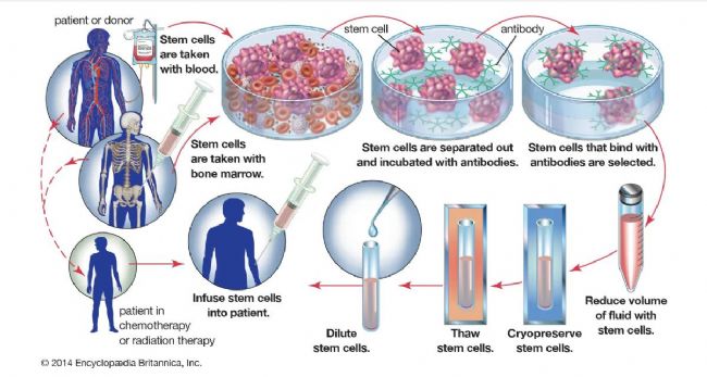 高劑量的化學(xué)療法或放射線不僅會(huì)破壞癌細(xì)胞,還會(huì)破壞富含造血干細(xì)胞的骨髓。為了替換受損的骨髓,在治療前從癌癥患者的血液或骨髓中采集干細(xì)胞;細(xì)胞也可以取自遺傳相容的供體。為了從樣品中去除不需要的細(xì)胞,例如腫瘤細(xì)胞,將其與僅與干細(xì)胞結(jié)合的抗體一起孵育。包含選定細(xì)胞的液體體積減少并冷凍直至需要。然后將液體解凍、稀釋并重新注入患者體內(nèi)。一旦進(jìn)入血液,干細(xì)胞就會(huì)進(jìn)入骨髓,在那里它們植入自己并開始產(chǎn)生健康細(xì)胞。